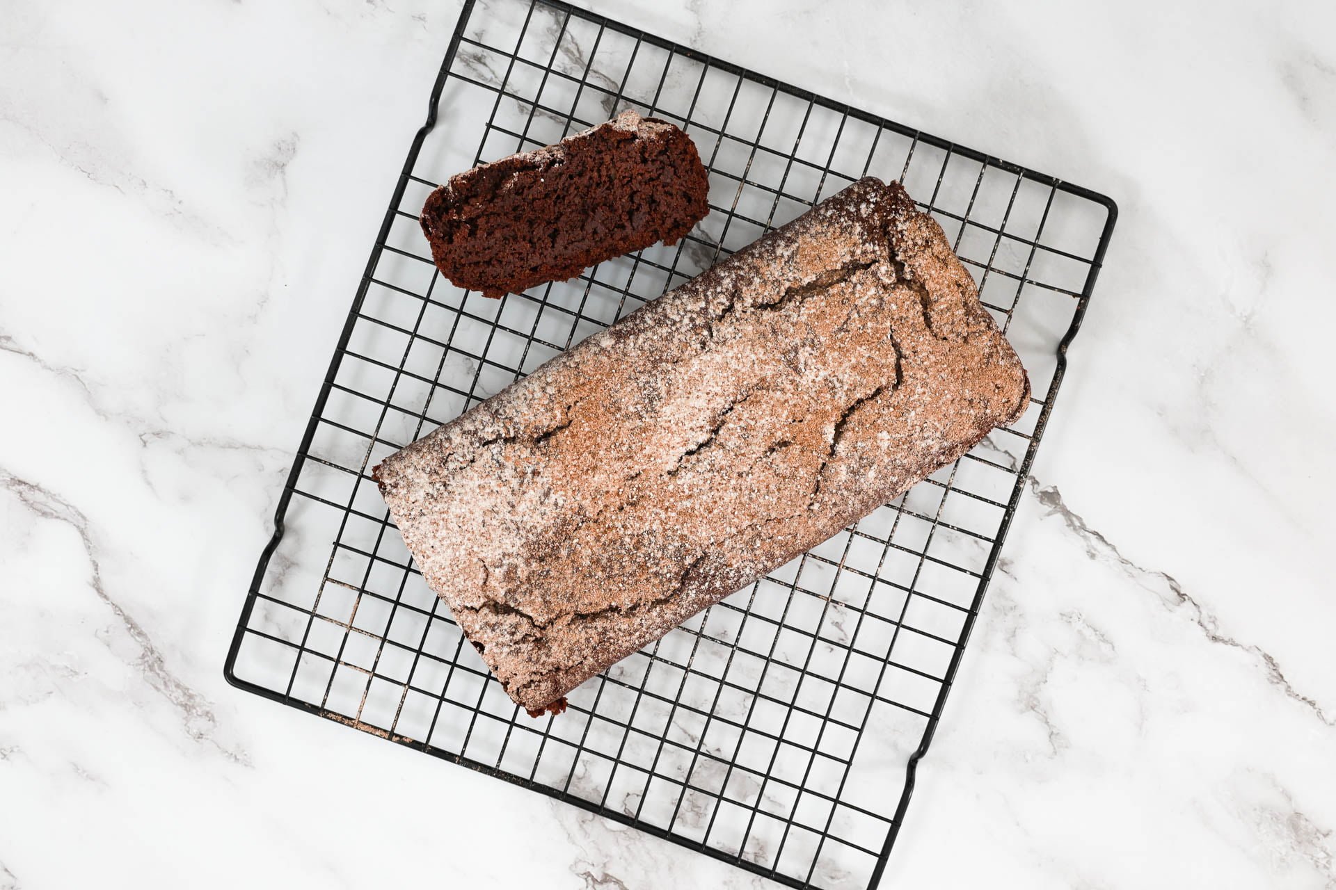 2 EL Puderzucker und 1 EL Kakao mit einem Sieb über den Schokoladenkuchen streuen