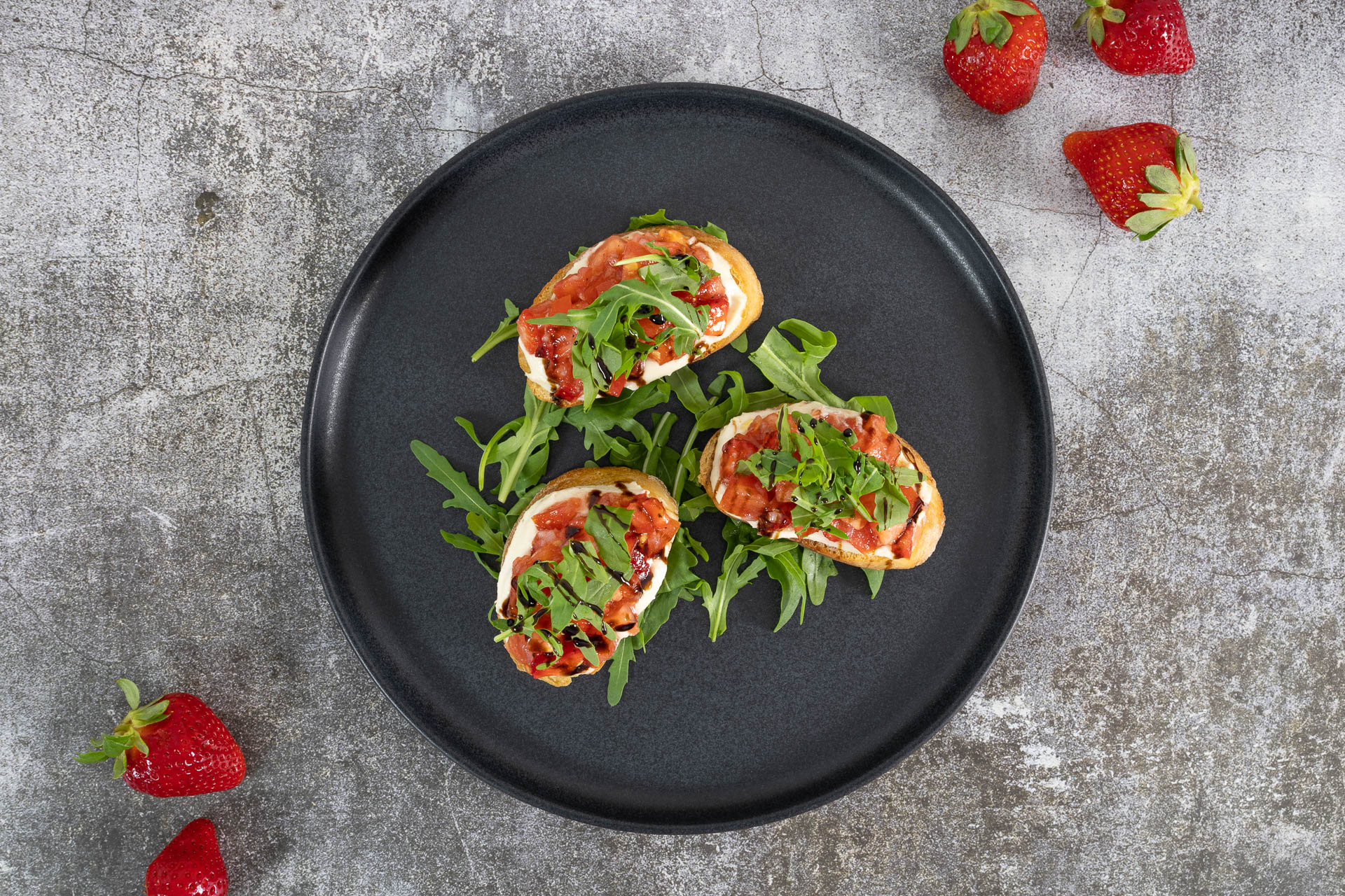 Die Ciabatta-Scheiben abkühlen lassen, dann grosszügig mit Knoblauch-Cashewcreme bestreichen, 1 EL Tomaten-Erdbeermischung darauf verteilen und mit etwas Rucola und wenig Aceta Balsamico Crema garnieren