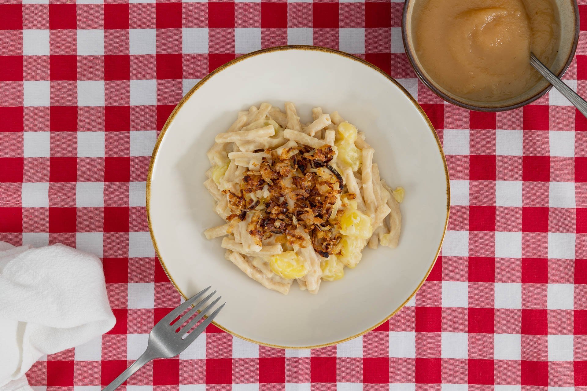 Älplermagronen in einen Teller geben, etwas Röstzwiebeln darauf verteilen und mit Apfelmus servieren