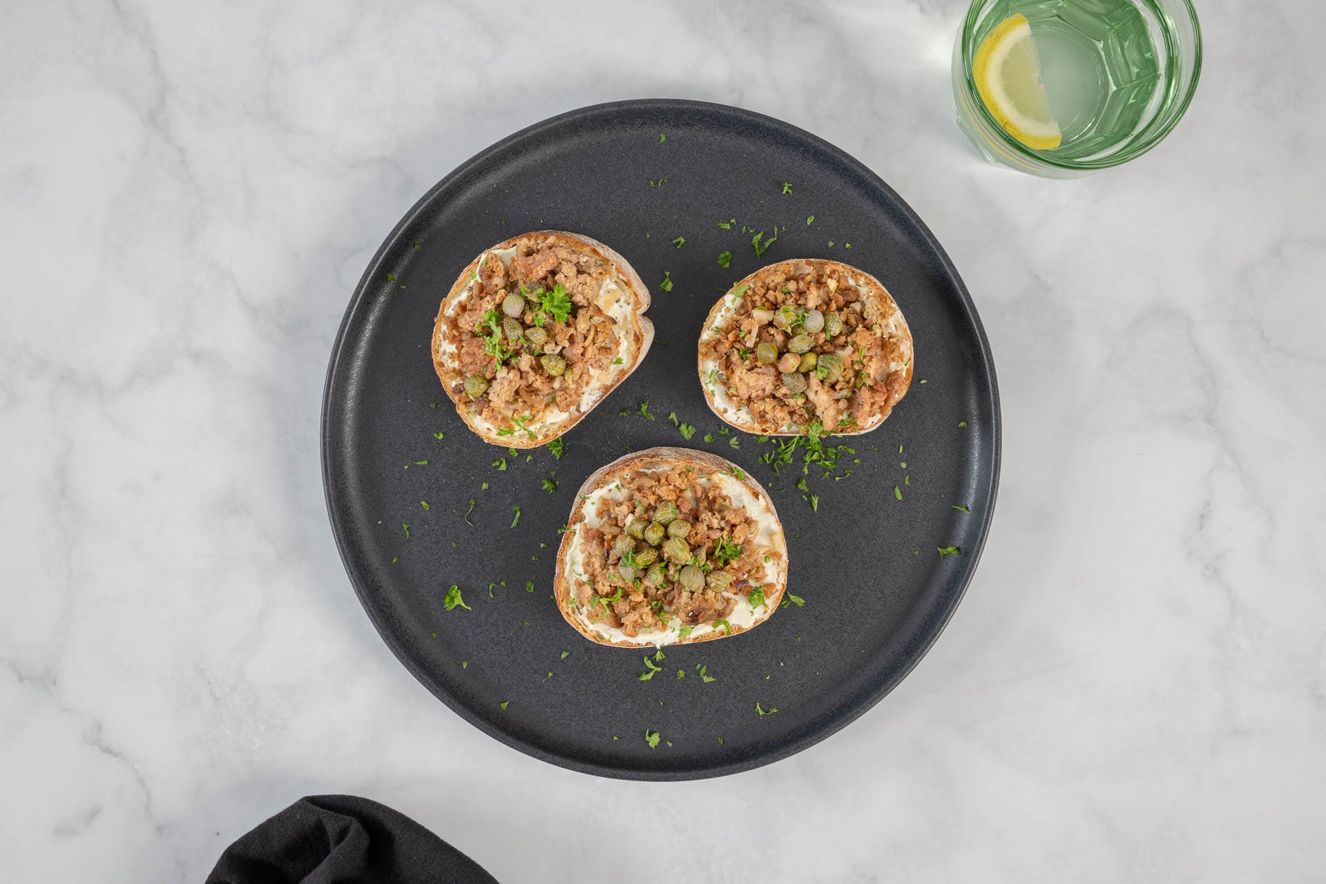 Vegane Crostini mit Frischkäse und pflanzlichem Hack