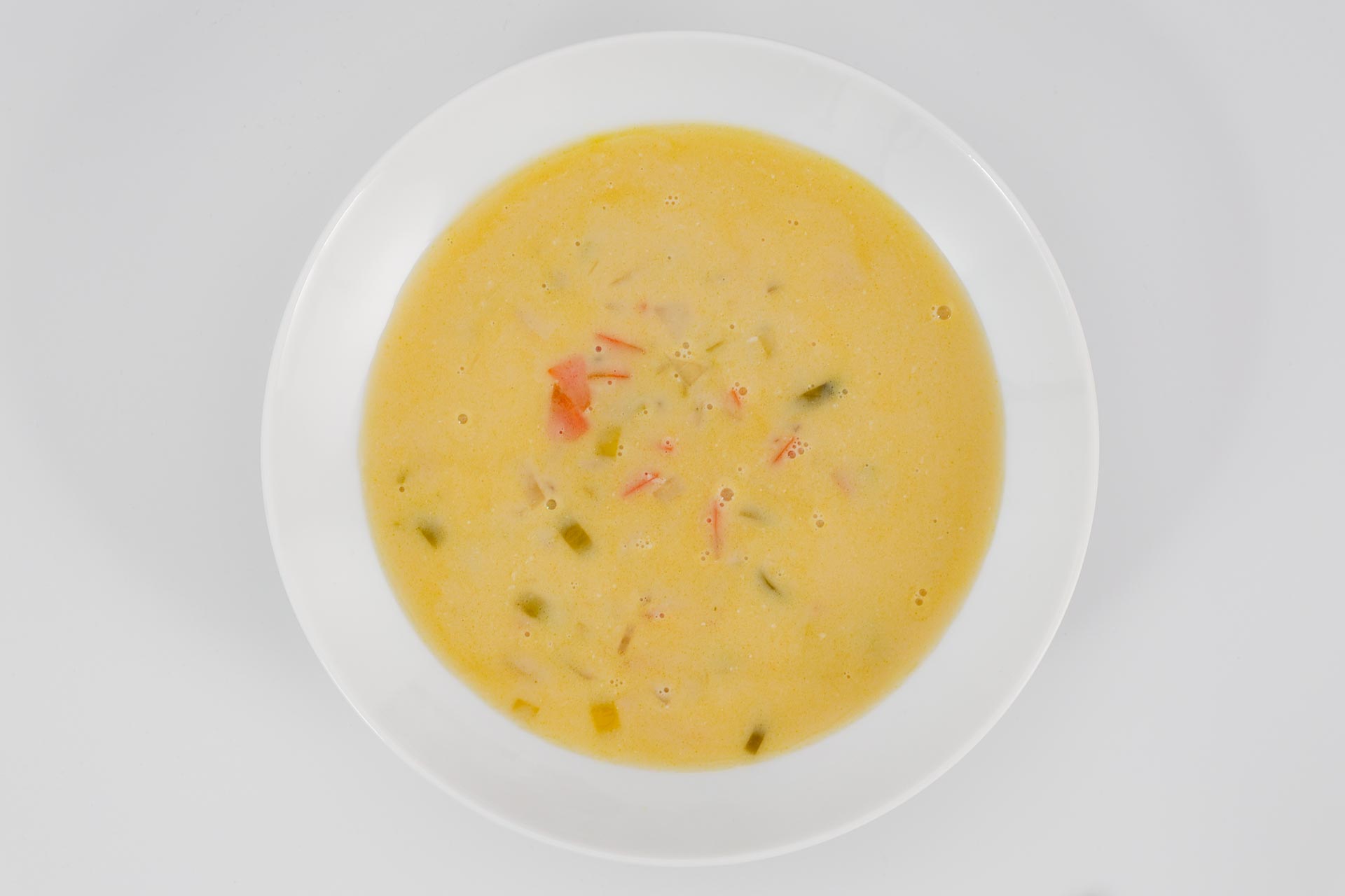 Rüebli und Sellerie schälen und in kleine Würfel schneiden (ca. 5 mm), den oberen grünen Teil des Lauchs wegschneiden, den Rest vierteln und in feine Streifen schneiden, Zwiebel fein hacken