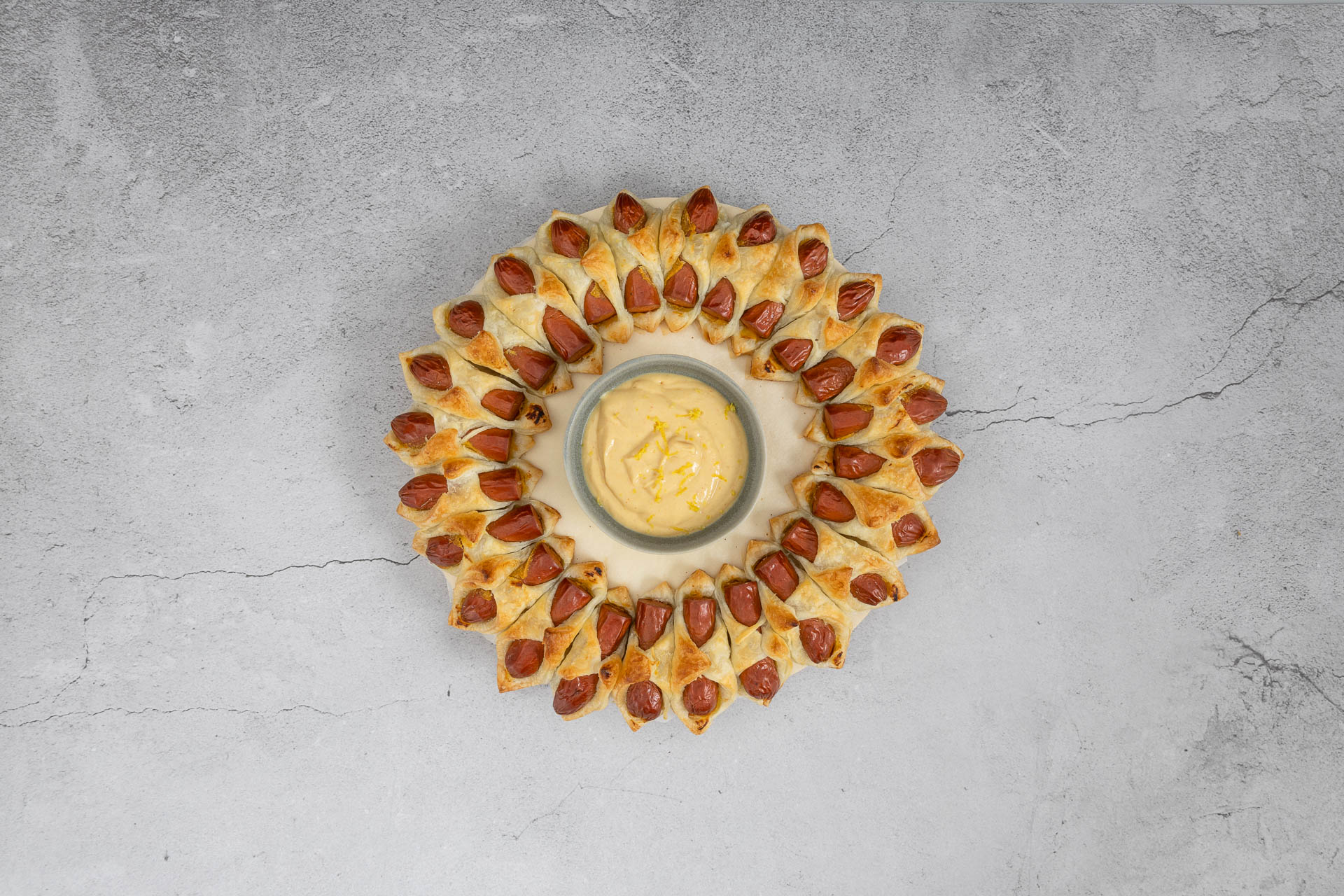 Die Wienerli im Teig auf diesem Kreis zu einem Kranz anordnen