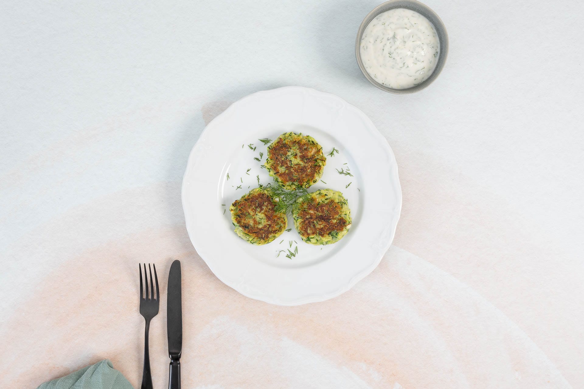 Knusprige Zucchetti-Puffer ganz ohne Ei, aussen goldbraun und innen saftig. Dazu ein frischer veganer Joghurt-Dip mit Dill und Zitrone. Ein unkompliziertes Gericht, das auch Zucchetti-Skeptiker überzeugt.