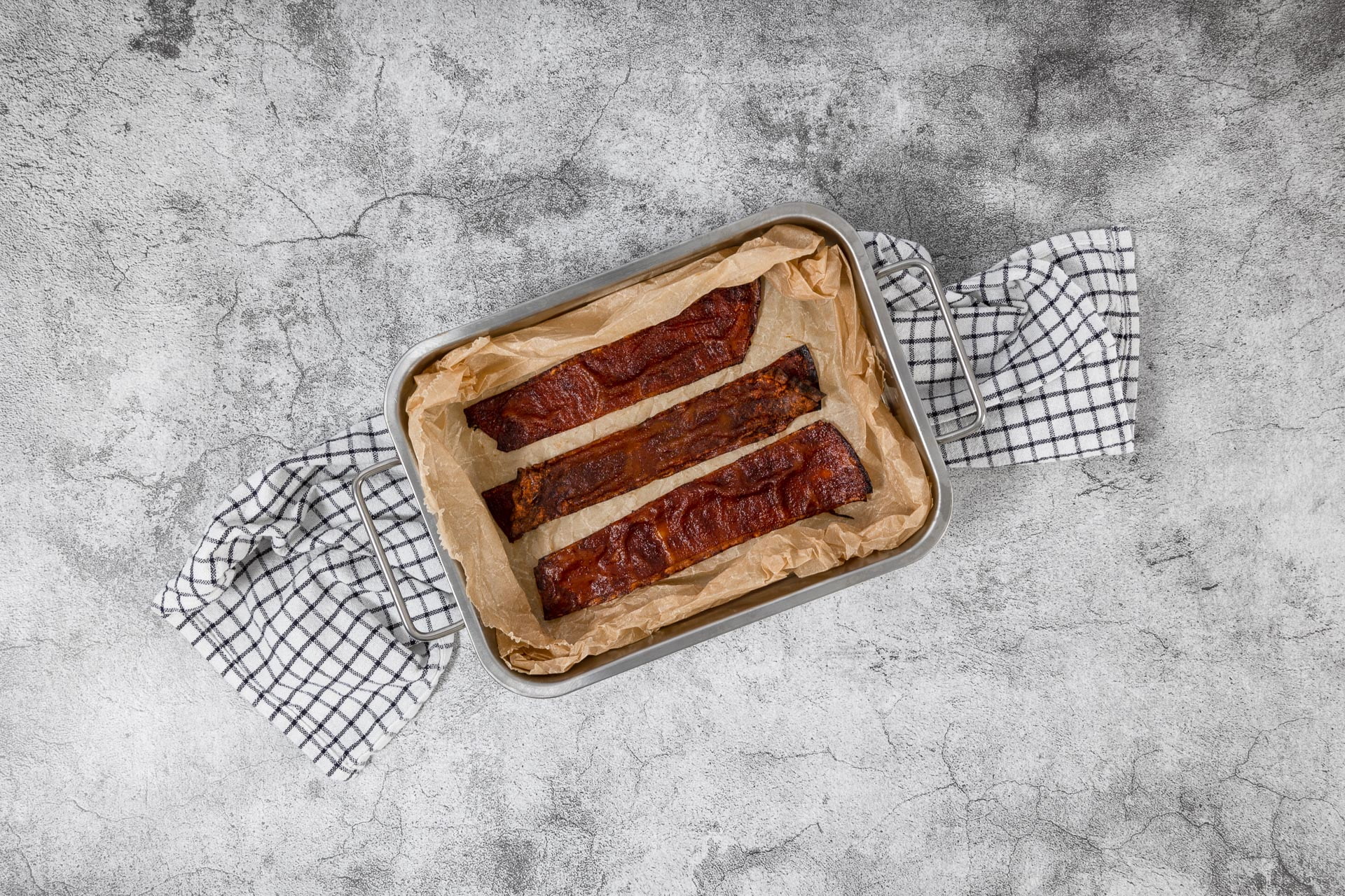 Blech aus dem Ofen nehmen und die Bacon Streifen vollständig auskühlen lassen