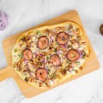 Die Zwiebeln und den Räuchertofu auf den beiden Flammkuchen verteilen, die Feigenscheiben darauflegen und am Schluss die gebacken Nüsse darüber verteilen