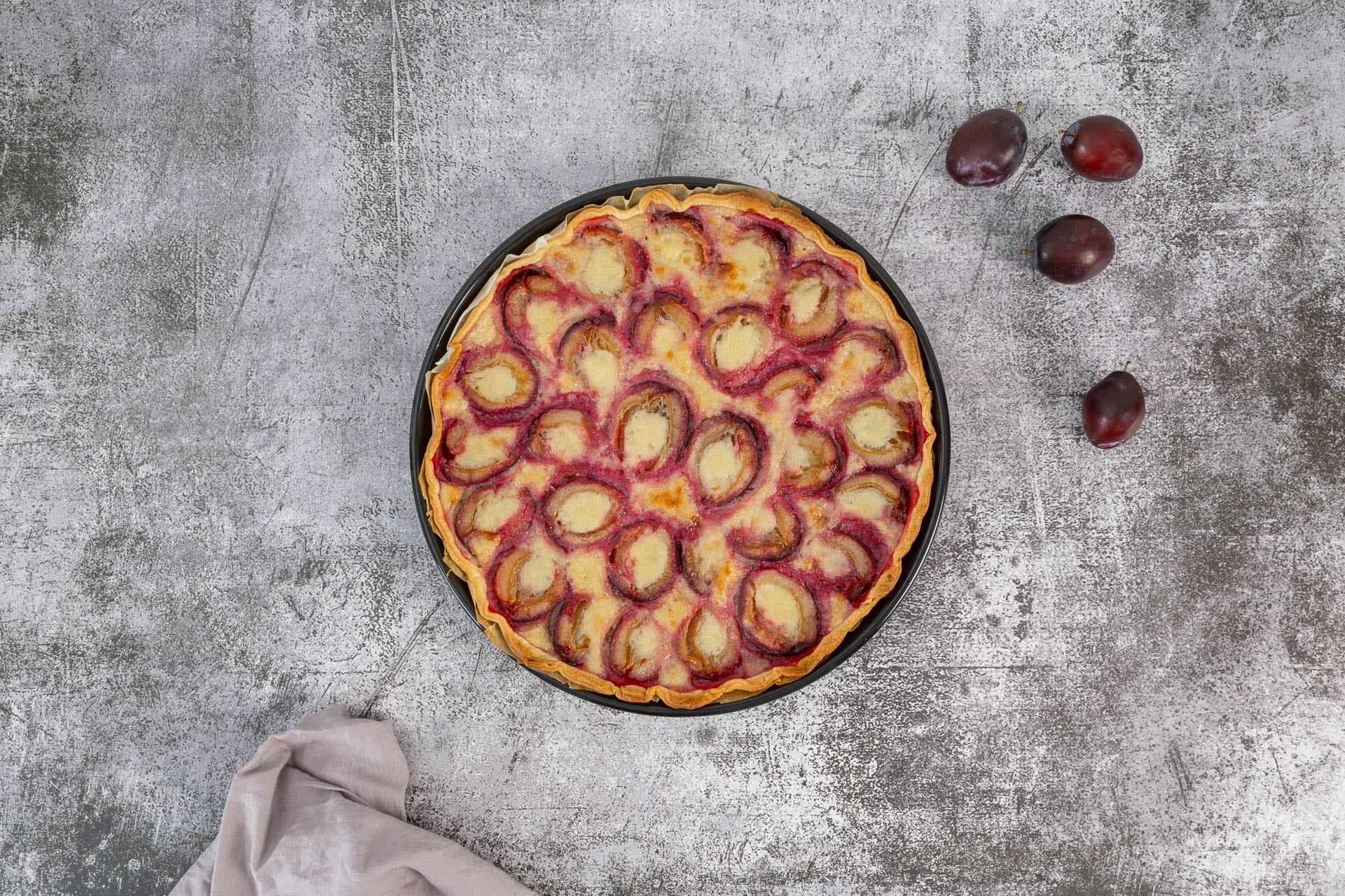 Zwetschgenwähe aus dem Ofen nehmen und 10 bis 15 Min auskühlen lassen
